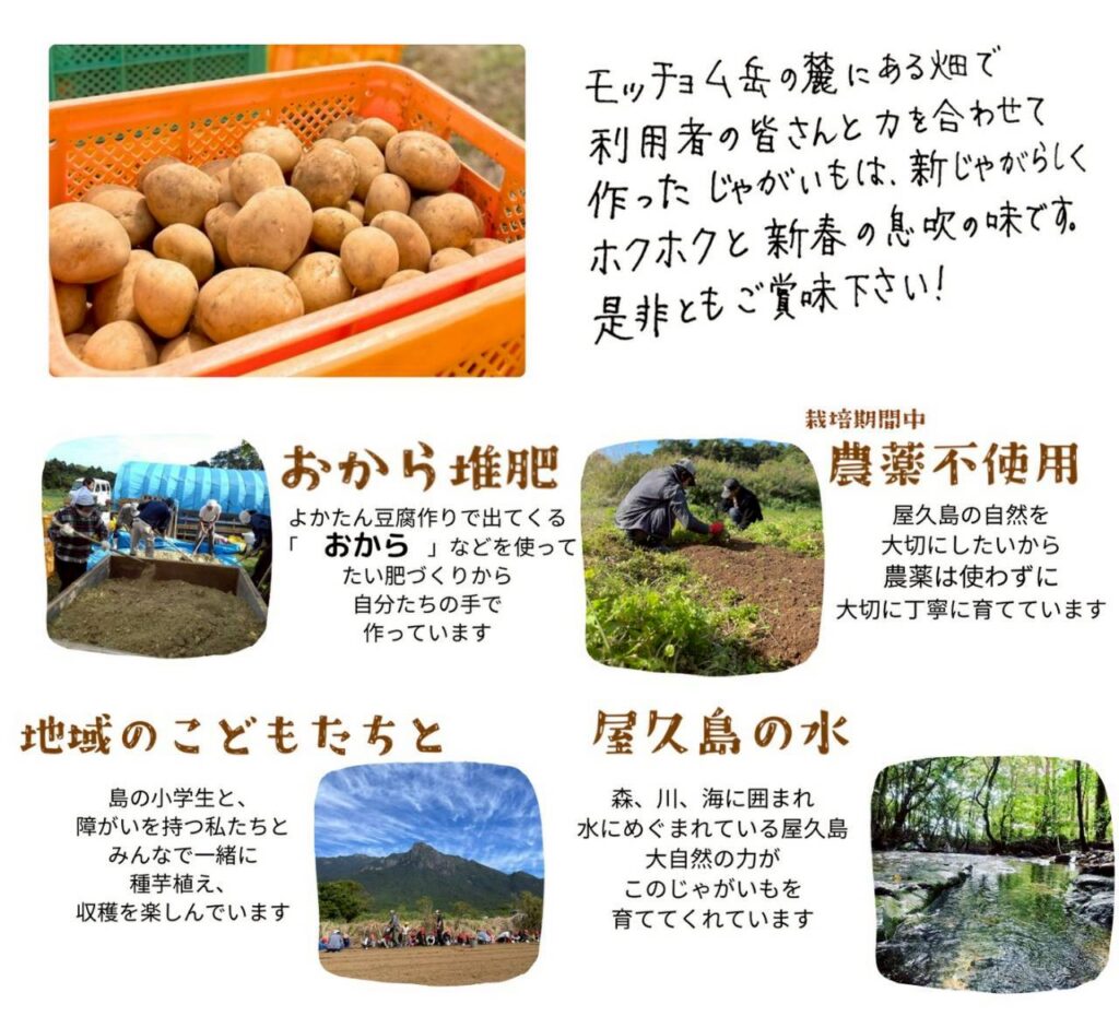 NPO法人じゃがいものおうちは、障がいのある人もない人も、その人がその人らしく屋久島で幸せに暮らせることを願う人たちが集まってつくられた団体です。
