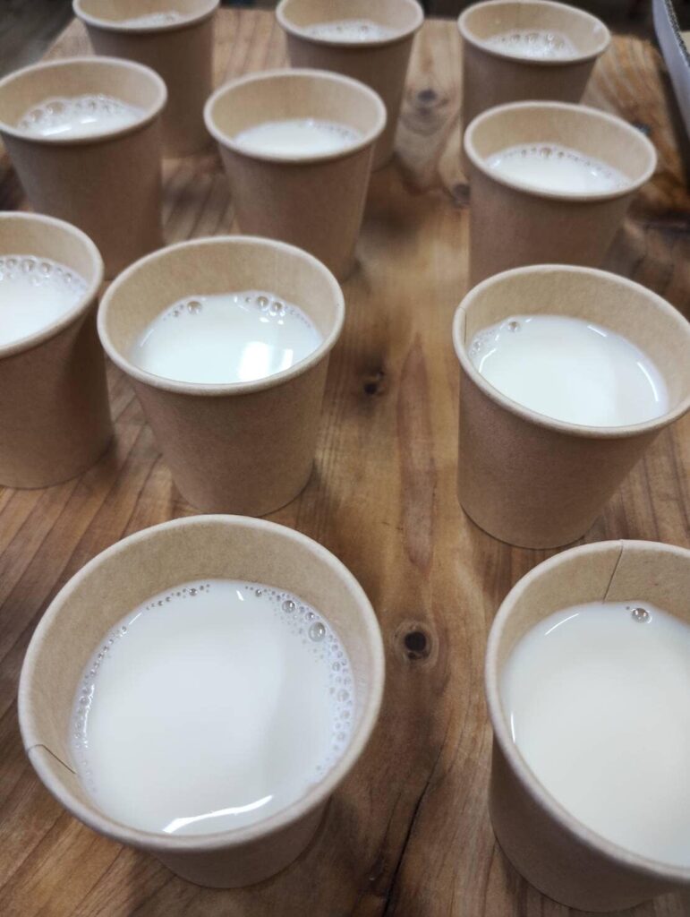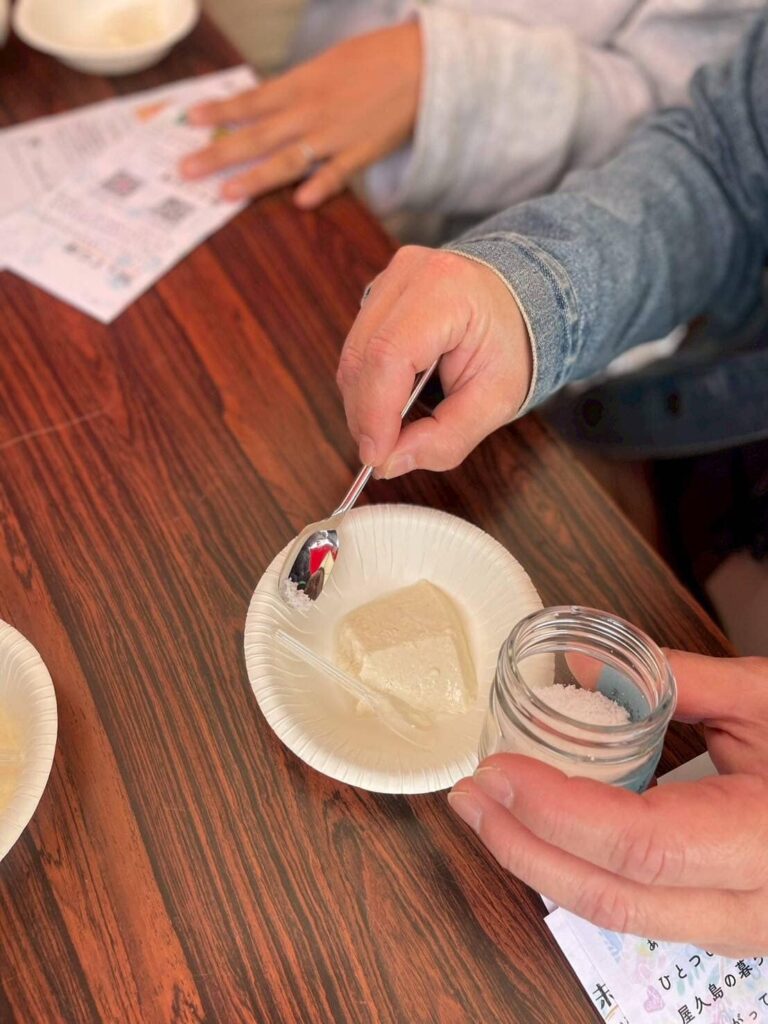 出来立ての豆乳、寄席豆腐や木綿豆腐の試食、1~4番塩の食べ比べ、
