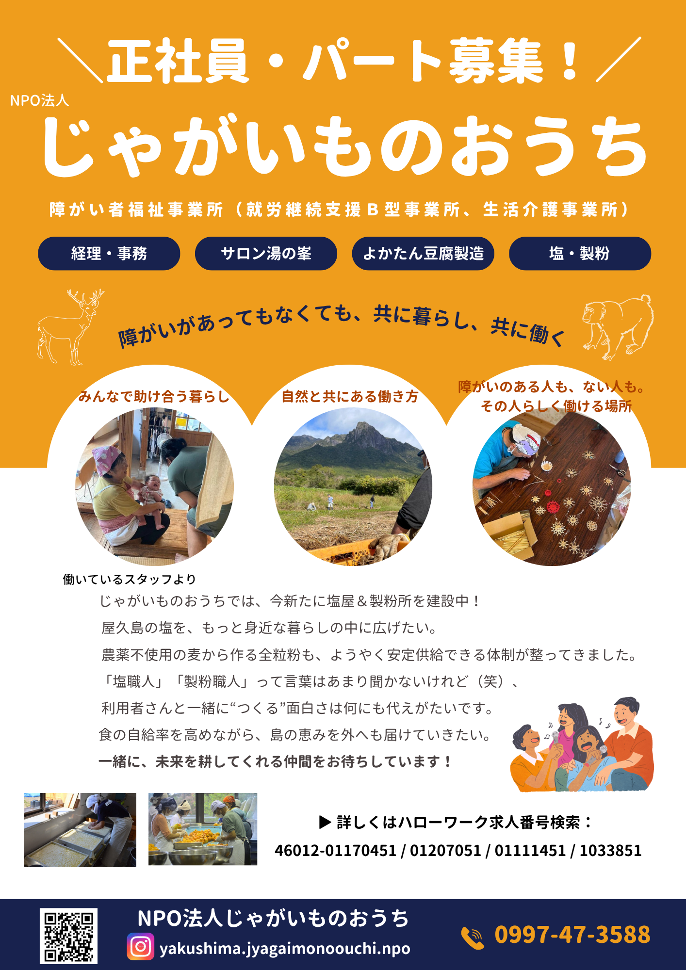 障がい者福祉事業所(就労継続支援B型事業所、生活介護事業所)NPO法人じゃがいものおうちでスタッフの募集が始まりました。 ▼雇用についての詳細はハローワークをご確認ください。お待ちしております。詳細を…
